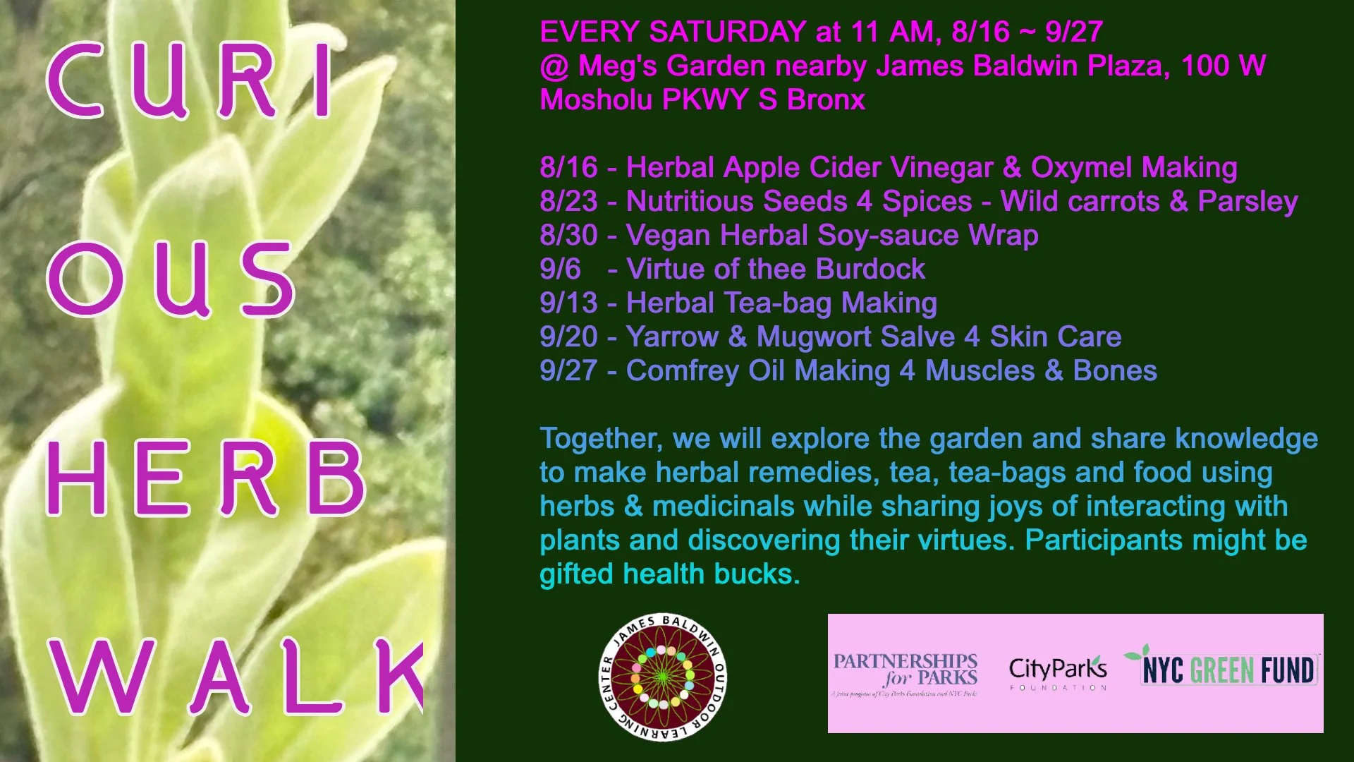 Please join the curious herb walk and let’s have fun together while learning about the magic of plants growing in the neighborhood. No experience or skill is required. But curiosity and openness are welcome.