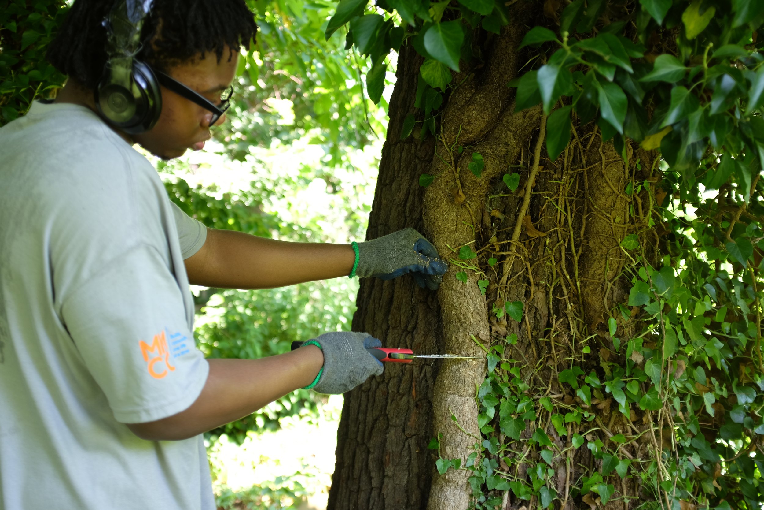 Summer 2025: One of SYEP interns removes English Ivy from a tree (Eytan Stanton)